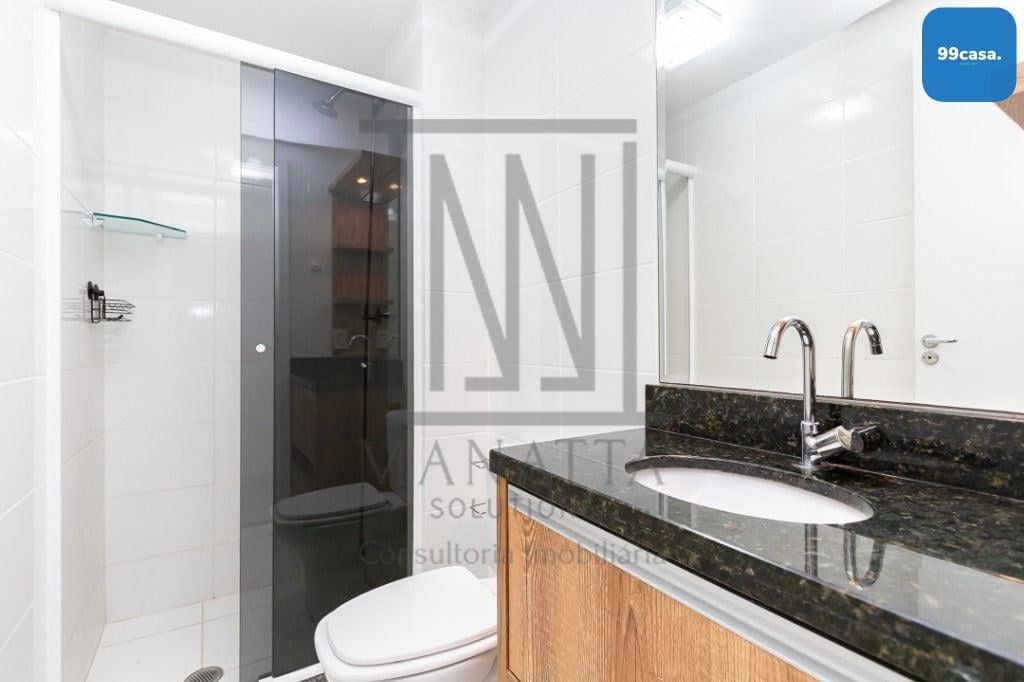 - Banheiro social com box de vidro e armários planejados
