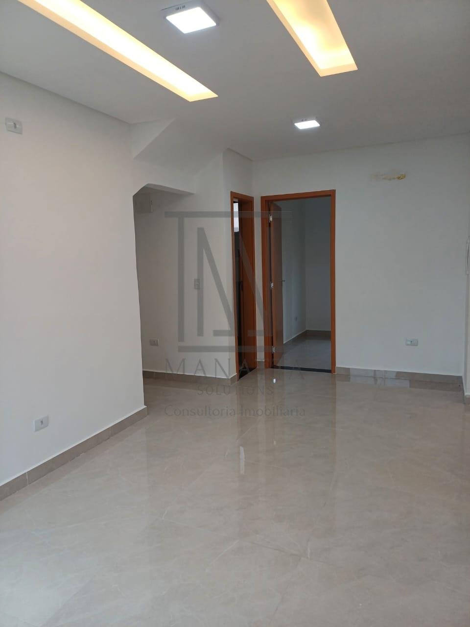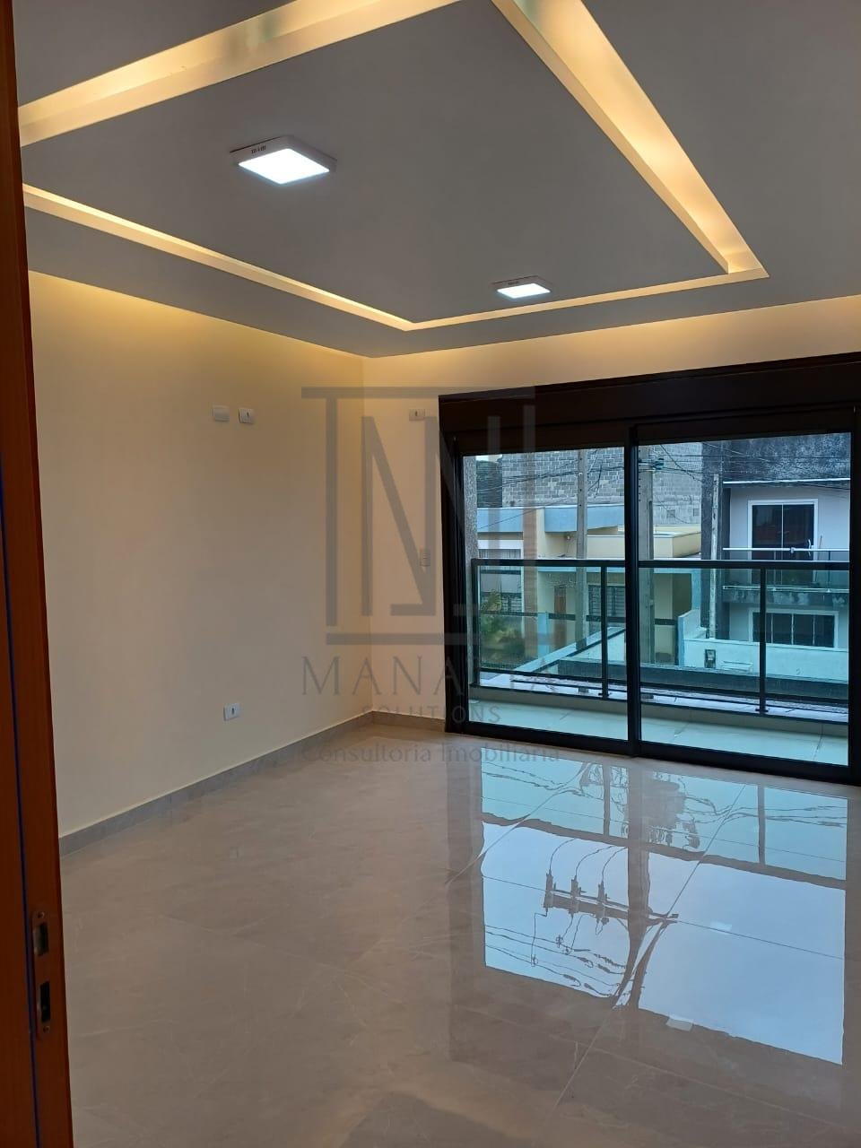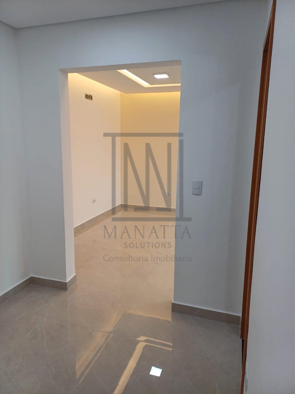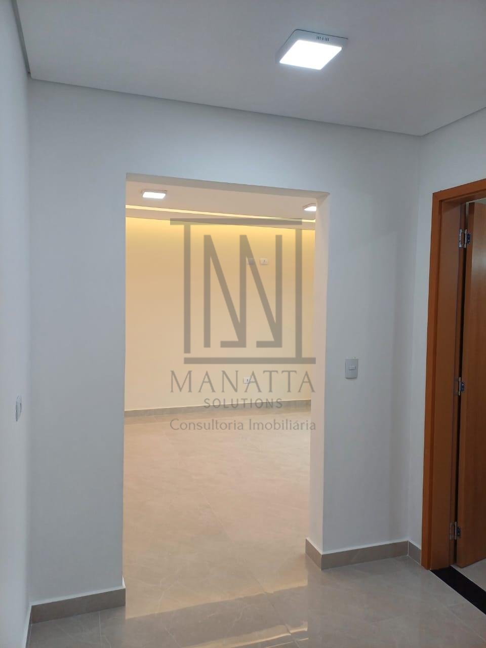 - Sala de estar, jantar e cozinha integradas com acabamento em gesso e iluminação embutida